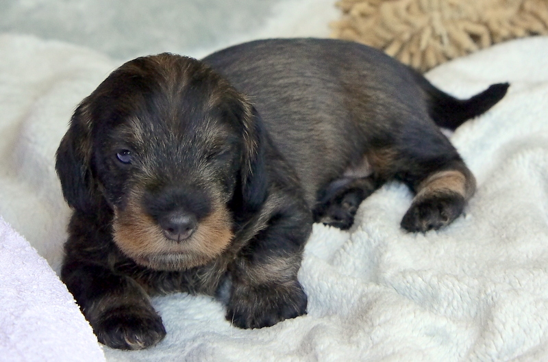 Enno und Easy sind jetzt schon 3 Wochen alt und langsam kommt Bewegung in die Wurfkiste, sie fangen mit den ersten Beißspielchen an. Die Beißerchen sind bei Easy auch schon schön zu sehen. Bei Enno blitzen bisher nur die Eckzähne durch, er braucht die Energie eher für das Wachstum seines Luxuskörpers und der Barthaare, der Bart entwickelt sich bei ihm nämlich in Richtung Klobürste. Es gab auch schon die erste feste Mahlzeit, Schabemett, welches beide mit großem Appetit verputzt haben. Und heute waren sie zum erstenmal draußen und haben mal kurz Sonne und Frischluft genossen. Auf alle Fälle sind beide richtig süße und hübsche Dackelkinder.